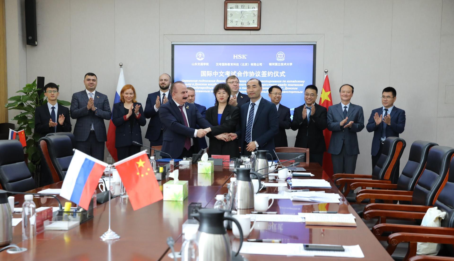 会上,孔伟金与黄蕾、贝萨里昂·梅什西分别签署《国际中文考试合作协议》和《山东交通学院顿河学院博士联合培养补充协议》。