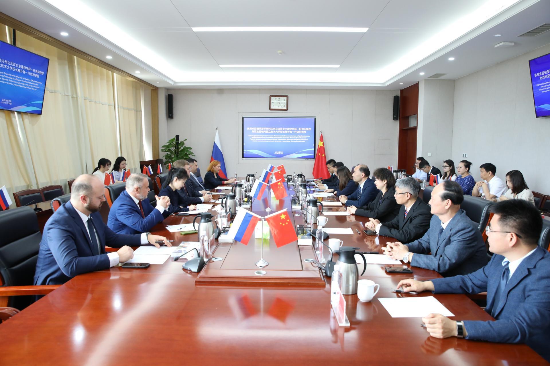 王焕斌表示,学校自2003年同俄罗斯高校建立合作关系以来,始终践行“平等交流、务实合作、互利共赢、持续发展”的国际化办学理念,从校际交流开始做起,到联合申报并获批中外合作办学项目,再到2019年共同建立非独立法人中外合作办学机构顿河学院,历经20余年的发展,学校中俄合作办学已成为山东省教育对外开放的典范和品牌。在国家对外开放新形势下,学校明确提出国际合作交流工作要同学校内涵建设、交通行业成长、驻地城市发展深度融合,学校的对俄合作交流不仅促进了学校师生国际交流、专业建设和学科发展,也为城市的国际化建设贡献力量,2023年学校以顿河学院为基础,促成了俄罗斯罗斯托夫州首府顿河畔罗斯托夫市同济南市缔结友好城市关系,此次代表团的到来,必将推进罗斯托夫州同山东省之间更广泛的交流与合作,希望双方共同努力,续写中俄合作交流新篇章。